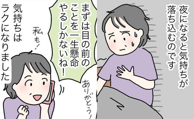 このままでは仕事にも悪影響が出てしまうと、思い切って同年代の友人に相談しました。話してみると、その友人も同じように不眠の悩みを抱えていました。それからは毎日、お互いの報告をし合うようになりました。そうして、「考えても答えは出ない問題ばかり。まずは目の前のことを一生懸命やるしかないね」ということに。母の介護も姉と連絡を取り合い、できる範囲で話し合いながら分担するようにしました。人と話すことで不安がなくなるわけではないけれど、気持ちはラクになります。