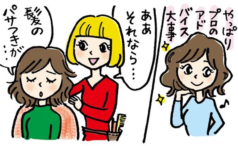 ヘアオイルをつけてもどうしても肌に合わなくて、髪の毛がパサついてまとまりにくいことを美容師さんに相談したところ、きれいな状態をキープするにはだいたい1カ月半から2カ月おきくらいでカットをするのがおすすめだと言われました。また、カラーリングも部分染めにすると髪の毛へのダメージが少なくなるので、髪全体を染めないようにとのアドバイスも受けました。