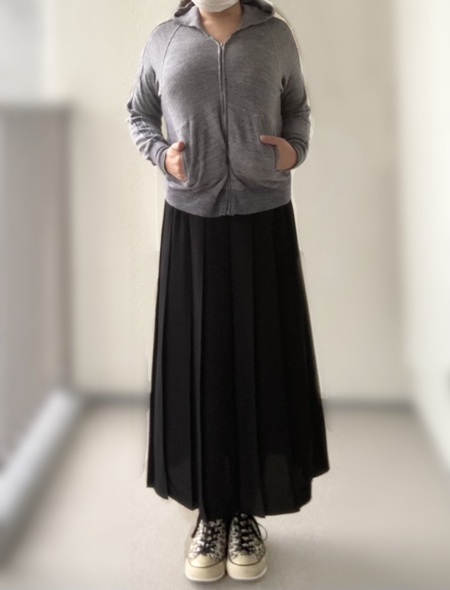ビッグシルエットがトレンドの昨今、たまにはタイトなものが着たくなりますよね。きれいめなロングプリーツスカートだから、あえてジャストサイズのグレーのジップアップフーディーのパーカを合わせて。