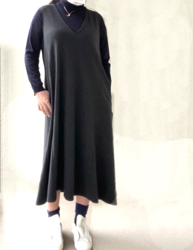体型カバーをしてくれるゆったりジャンパースカート。Vネックで着痩せ効果もアリ。インナー次第でいろいろな着こなしが楽しめます。今回はユニクロのジャンパースカートを大人っぽく着こなしてみました。